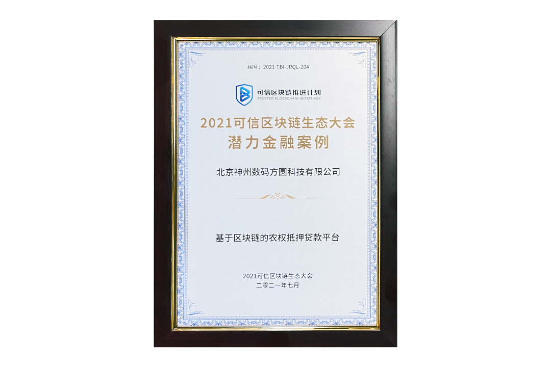 7月13日,由中国信息通信研究院、可信区块链推进计划主办的“2021可信区块链生态大会”在京举办,并隆重发布系列成果。神州信息子公司北京ng28南宫方圆科技有限公司(简称:神州方圆)推荐的“基于区块链的农权抵押贷款平台”荣获十大金融应用高潜力案例,为“区块链+农业”落地带来示范效应。
